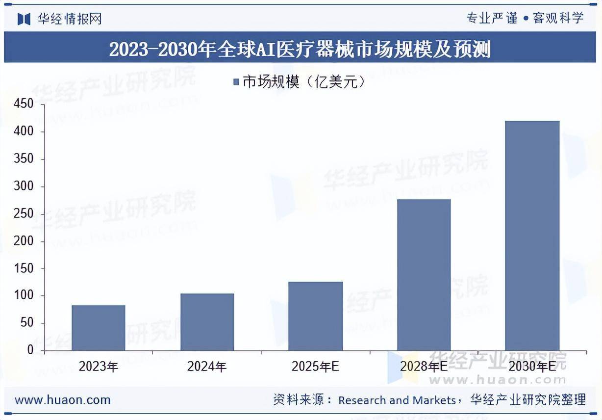 人工智能目前已渗透至各个领域,人工智能医疗器械作为其中的典型代表,在医学影像处理、手术机器人和辅助诊疗等领域的应用愈发广泛,已成为医疗器械行业的热点和焦点。从全球角度看,2024年全球AI医疗器械市场规模突破百亿美元,预计2030年全球AI医疗器械市场规模将达到421亿美元。