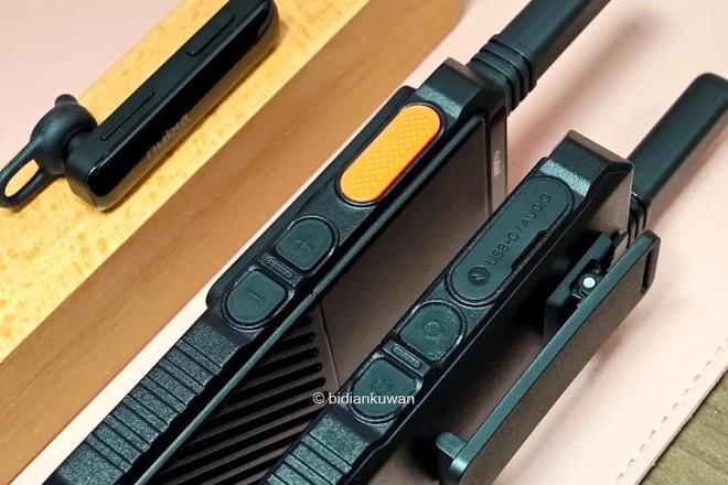 按键、接口均安置在侧面,左侧橙色通话键面积较大,靠下的加减键负责音量;右侧从下到上分别是开关、多功能键,以及带防水盖的USB-C充电口和3.5mm耳机接口(里面还安置了一个Reset复位孔)。