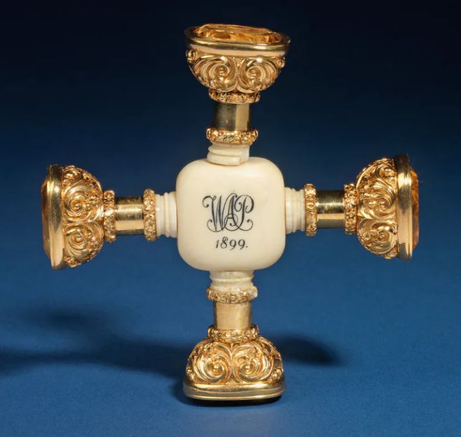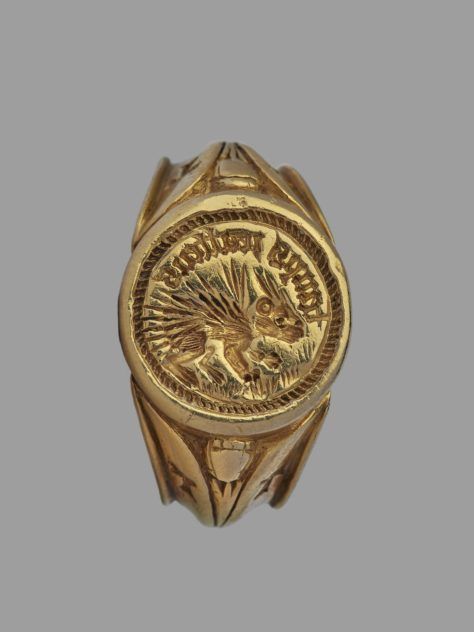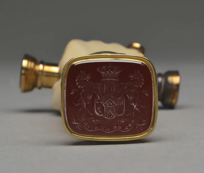 这枚藏于大英博物馆的“握拳形”桌面印章,整体就是用黄金和象牙制成的,印章顶端的装饰是一个攥紧的拳头造型:拳头里握着一根金短杖,小指上还戴着一枚戒指。印章的印面是红玉髓材质,刻着格伦高尔家族的家训 “上帝为吾引”,还有家族专属的纹章。