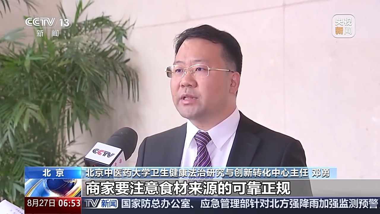 北京中医药大学卫生健康法治研究与创新转化中心主任 邓勇:商家要注意食材来源的可靠正规,严把食材关,在销售时要注意,不能够虚假宣传,夸大宣传。从监管部门的角度来讲,要包容审慎,就是既要鼓励新中式养生的这样一种产业发展,鼓励创新创业。另外要严格按照现行的食品安全法、药品管理法、广告法和反不正当竞争法等相关的法律规定来进行相应的监管。