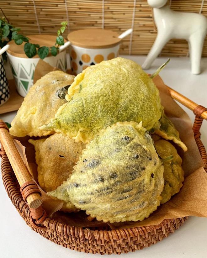 第三步炸紫苏叶:紫苏叶洗干净,用厨房纸吸干水分(没水分才能挂住糊);锅里倒油,油温六成热时(扔一点面糊,面糊浮起来就好),把紫苏叶放进面糊里,均匀裹一层,放进锅里炸。