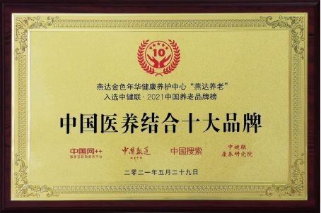 2018年3月,由中国国际养老产业博览会组委会联合相关行业协会、机构主办的2018中国国际养老产业发展高峰论坛上,燕达金色年华健康养护中心获评“2018 中国医养结合十大品牌”称号,并授予牌匾证书。