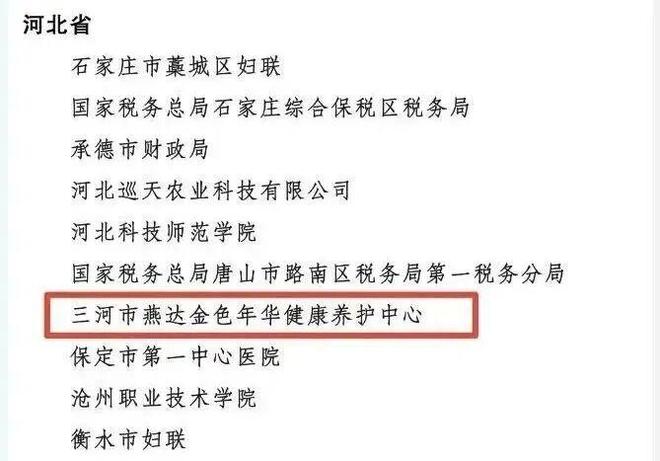 2019年12月,河北省卫生健康委、河北省民政厅联合发文,经各地推荐、资料审核、现场核查等程序,拟确定33家单位为全省首批医养结合优质服务单位,燕达金色年华健康养护中心上榜。